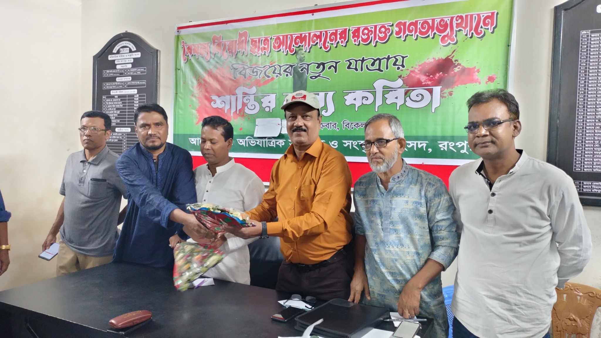 রংপুরে অভিযাত্রিক সাহিত্য ও সংস্কৃতি সংসদের আয়োজনে বৈষম্যবিরোধী ছাত্র আন্দোলনের রক্তাক্ত গণঅভ্যুথানে বিজয়ের নতুন যত্রায় শান্তির জন্য কবিতা আসর অনুষ্ঠিত হয়।