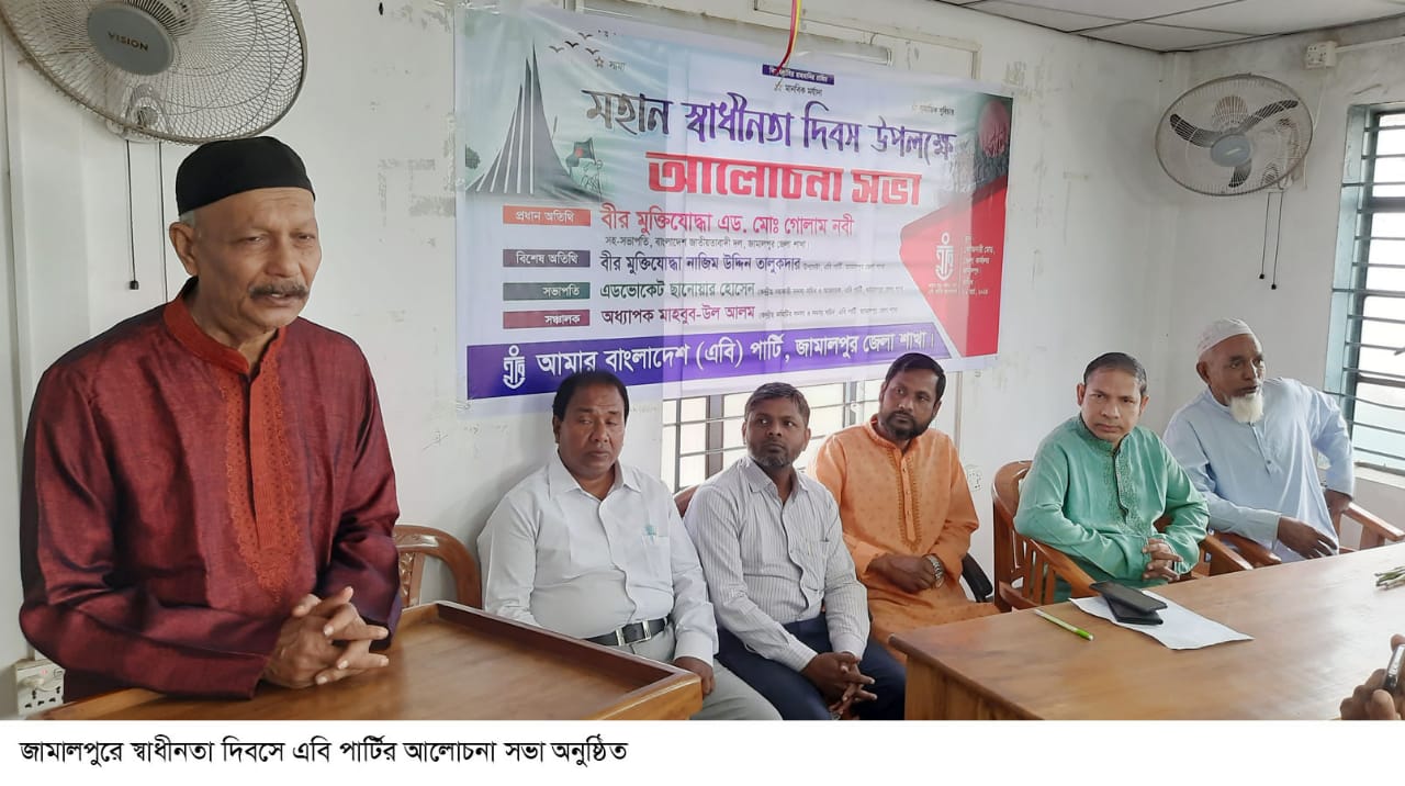 আমার বাংলাদেশ পার্টির কেন্দ্রীয় সহকারী সচিব ও এবি পার্টি জামালপুর জেলা শাখার আহবায়ক অ্যাডভোকেট ছানোয়ার হোসেনের সভাপতিত্বে আলোচনা সভায় প্রধান অতিথির বক্তব্য রাখেন জেলা বিএনপির সহ সভাপতি বীর মুক্তিযোদ্ধা অ্যাডভোকেট মো: গোলাম নবী। এছাড়াও বীর মুক্তিযোদ্ধা নাজিম উদ্দিন তালুকদার, এবি পার্টি জামালপুর জেলা শাখার যুগ্ম আহবায়ক অ্যাডভোকেট আনোয়ার হোসেন, এম এ খালেক, যুগ্ম সদস্য সচিব অ্যাডভোকেট মাহমুদুল হাসান, জেলা যুব পার্টির সমন্বয়ক শিহাব উদ্দিনসহ অন্যান্যরা বক্তব্য রাখেন। এ সময় বক্তারা বলেন, ১৯৭১ সালে পরাধীনতার বন্ধন থেকে বাংলাদেশ স্বাধীনতা অর্জন করে। কিন্তু স্বাধীনতার প্রকৃত সুফল এ দেশের জনগণ এখনো পায়নি। শাসক গোষ্ঠী আজ এই দেশ ও দেশের জনগণকে স্বাধীনতার নামে পরাধীন করে রাখার অপকৌশলে মেতে উঠেছে। স্বাধীনভাবে কথা বলা, প্রতিবাদ করা, ভোটাধিকারসহ সকল ন্যায্য অধিকার নিশ্চিত করার জন্য বক্তারা সবাইকে সোচ্চার হওয়ার আহবান জানান।