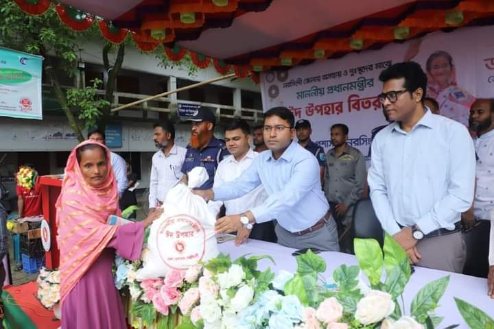 নরসিংদী রায়পুরা উপজেলার পাঁচশত অসহায় ও দুস্থদের মাঝে মাননীয় প্রধানমন্ত্রীর ঈদ উপহার বিতরণ করেছে জেলা প্রশাসন। শুক্রবার (১৪জুন)দুপুরে উপজেলার চত্বরে ঈদ উপহার বিতরণ করেন,নরসিংদী জেলা প্রশাসক ড. বদিউল আলম। ঈদ উপহারের মধ্যে ছিল, চাল ১০ কেজি, ২লিটার তেল, ডাল ১ কেজি, পেয়াজ ১কেজি, আলু ২ কেজি ও চিনি ৫০০।